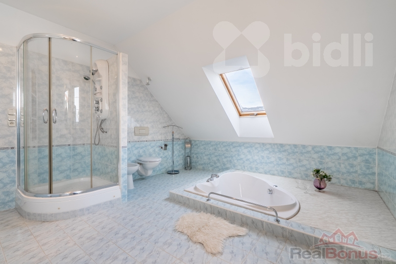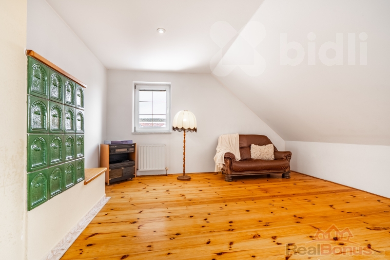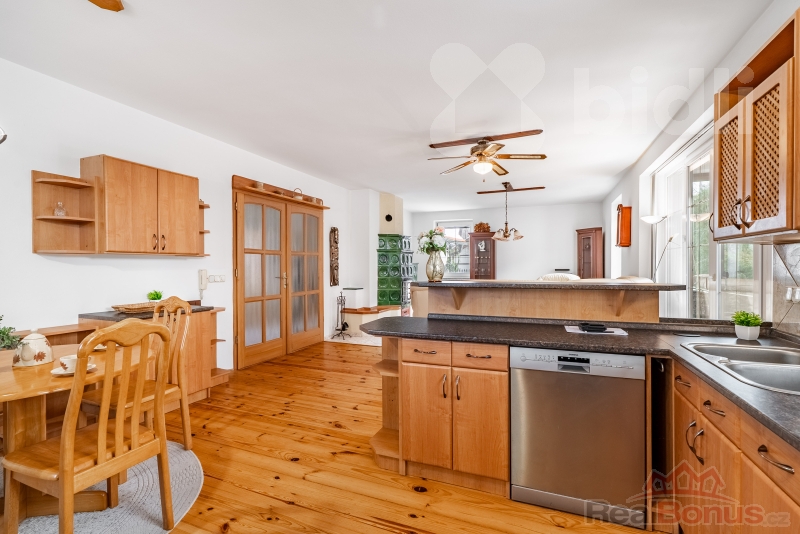 Střecha je pokryta pálenými taškami, dům je vytápěn tepelným čerpadlem, což zajišťuje nízké provozní náklady a stabilní teplotu. Teplovodní podlahové vytápění v přízemí a radiátory v podkroví zvyšují komfort, zatímco kachlová kamna ve společenské části přinášejí atmosféru, kterou pocítíte na první dotek. Podlahy jsou řešeny - keramická dlažba v přízemí a koupelnách, dubové parkety v pokojích, garáž a půda s pevným cementovým potěrem.