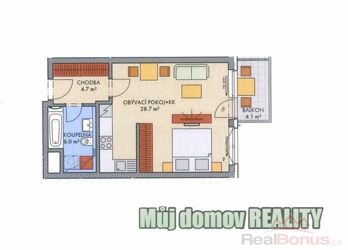 Byt má praktické a útulné dispoziční řešení. Součástí je obývací pokoj s kuchyňským koutem vybaveným moderní kuchyňskou linkou včetně spotřebičů, ložnice částečně oddělená policovou příčkou, vstupní chodba s vestavnou skříní a koupelna s WC.