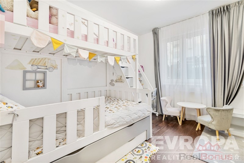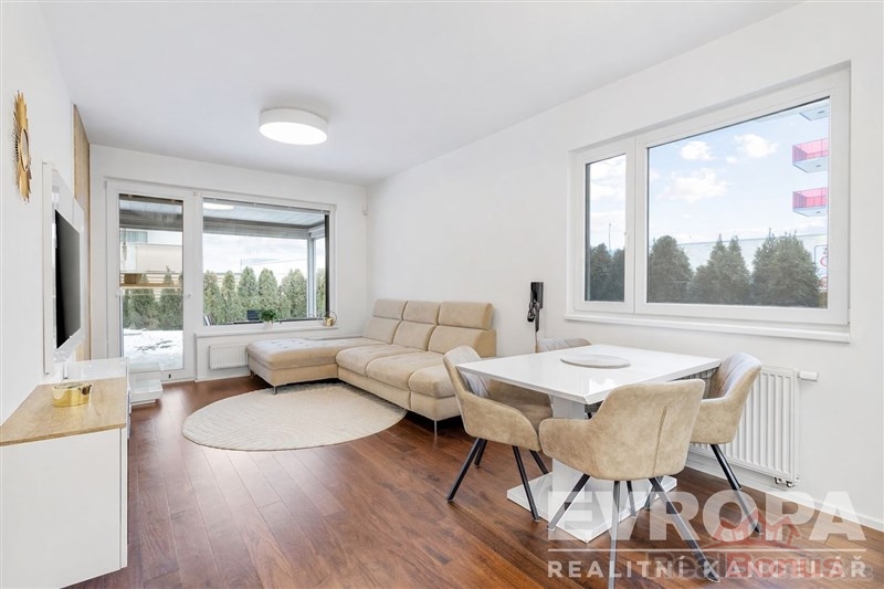 Interiér bytu byl kompletně realizován na míru s důrazem na kvalitu, funkčnost a nadčasový design. Nemovitost se prodává plně vybavená zakázkovým nábytkem, nový majitel tak může bydlet okamžitě bez jakýchkoliv dalších investic. Kuchyňská linka je osazena kvalitními spotřebiči značek BOSCH a SIEMENS, doplněna o vestavěnou vinotéku. Obývací část nabízí elegantní televizní stěnu s elektrickým krbem, který dotváří příjemnou atmosféru celého prostoru.