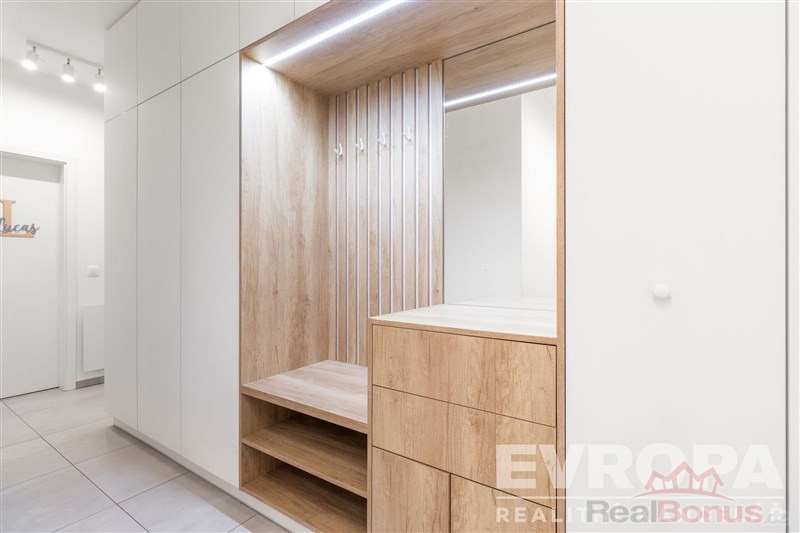 V celém bytě byly použity dřevěné podlahy, kvalitní obklady a dlažby, vše v nadstandardu oproti původnímu provedení od developera. Samozřejmostí jsou velkorysé vestavné skříně s promyšlenými úložnými systémy, včetně výsuvného botníku. Praktickým benefitem je samostatná komora s pračkou a sušičkou AEG z nejvyšší produktové řady. Koupelna byla kompletně upravena tak, aby nabízela jak vanu, tak sprchový kout a je doplněna podlahovým topením pro maximální komfort.