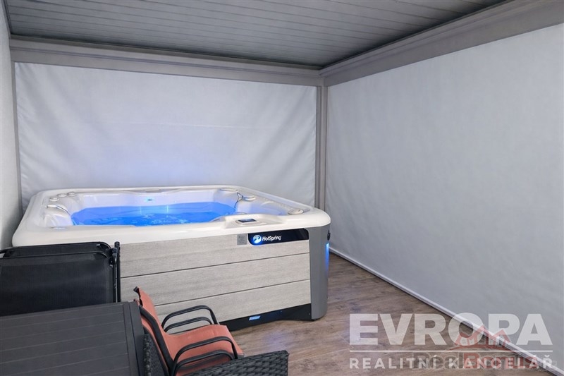 Jedním z hlavních lákadel této nemovitosti je unikátní venkovní prostor. K bytu náleží terasa o ploše 33 m s velkou bioklimatickou pergolou vybavenou screenovými roletami a LED osvětlením. Na ní navazující soukromá zahrada o velikosti 100 m. Zahrada je automaticky zavlažována, osázena tújemi a udržována robotickou sekačkou. Součástí zahrady zůstává také prostorná úložná bedna a dětský zahradní domek.