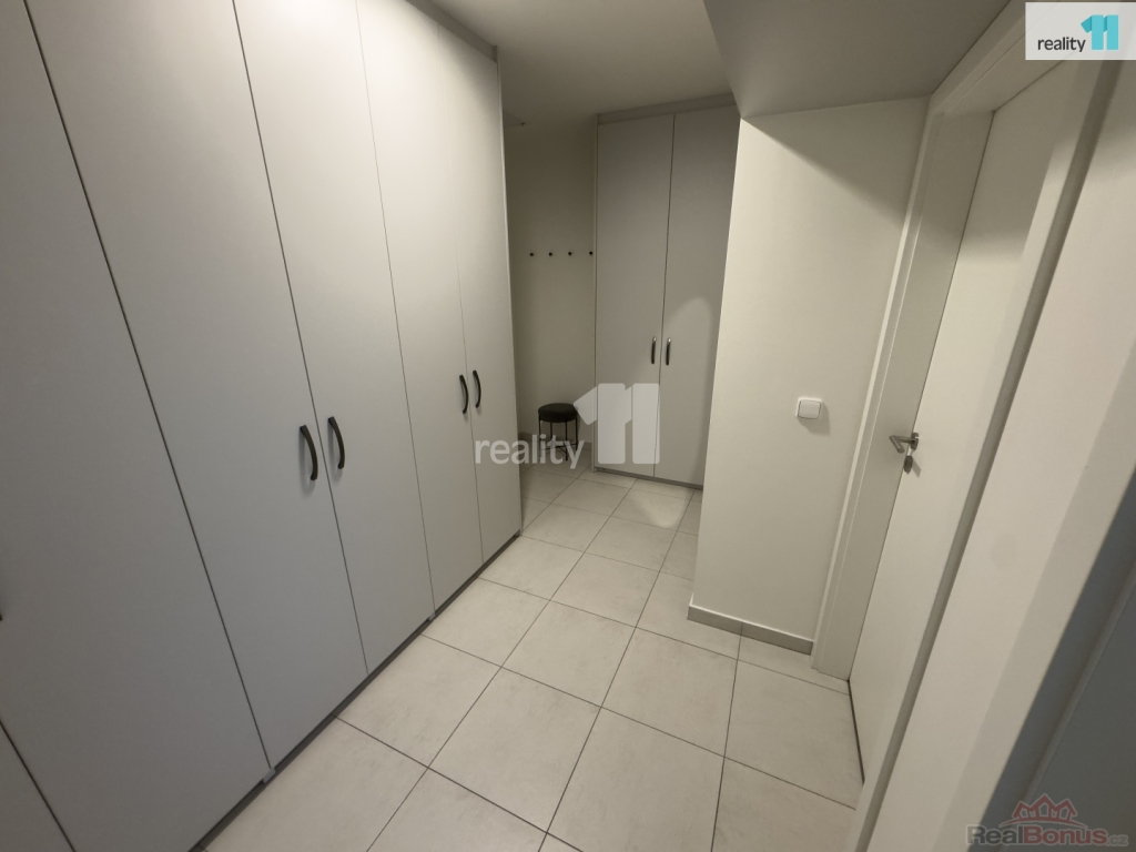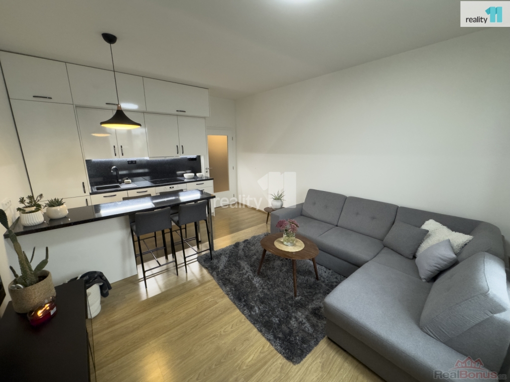 Minimalistický interiér bytu podtrhuje elegantní a nadčasový design kuchyňského koutu. Byt má plastová okna, vinylové podlahy a v chodbě velké množství úložných prostor na míru (vestavěné skříně jsou z roku 2022). Moderní kuchyňská linka je vybavena vestavěnými spotřebiči.