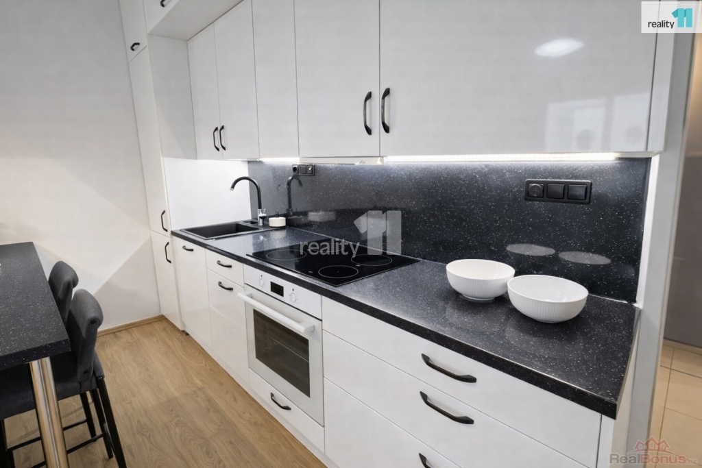 Dominantou bytu je obývací pokoj s kuchyňským koutem v otevřené dispozici, který působí vzdušně a příjemně. Minimalistický interiér podtrhuje elegantní a nadčasový design kuchyňské linky s vestavěnými spotřebiči. Prostor je ideální jak pro každodenní život, tak pro setkávání s přáteli.