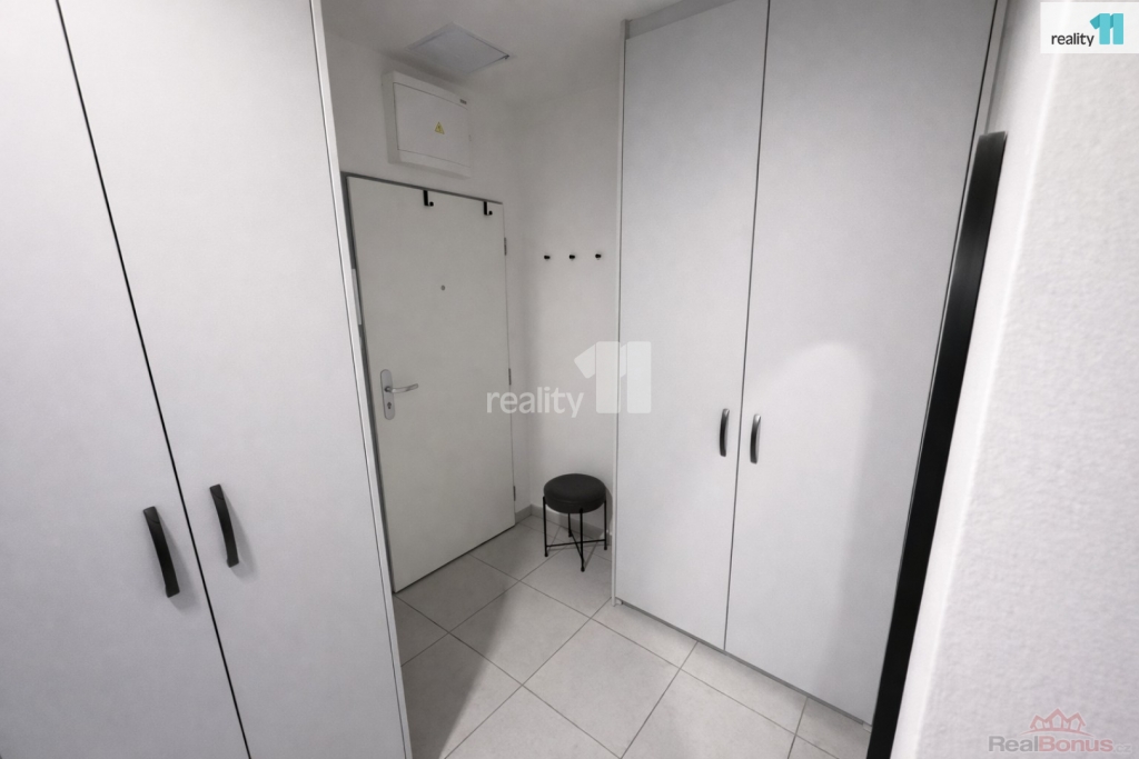 Byt je dispozičně řešen jako 2kk a působí světlým, moderním a velmi praktickým dojmem. Už při vstupu vás přivítá prostorná předsíň s vestavěnými skříněmi na míru, které poskytují dostatek úložných prostor a podtrhují čistý, uspořádaný charakter interiéru. Z předsíně je přímý vstup do koupelny s WC, vybavené vanou, umyvadlem a šikovně řešeným koutem pro pračku a sušičku.