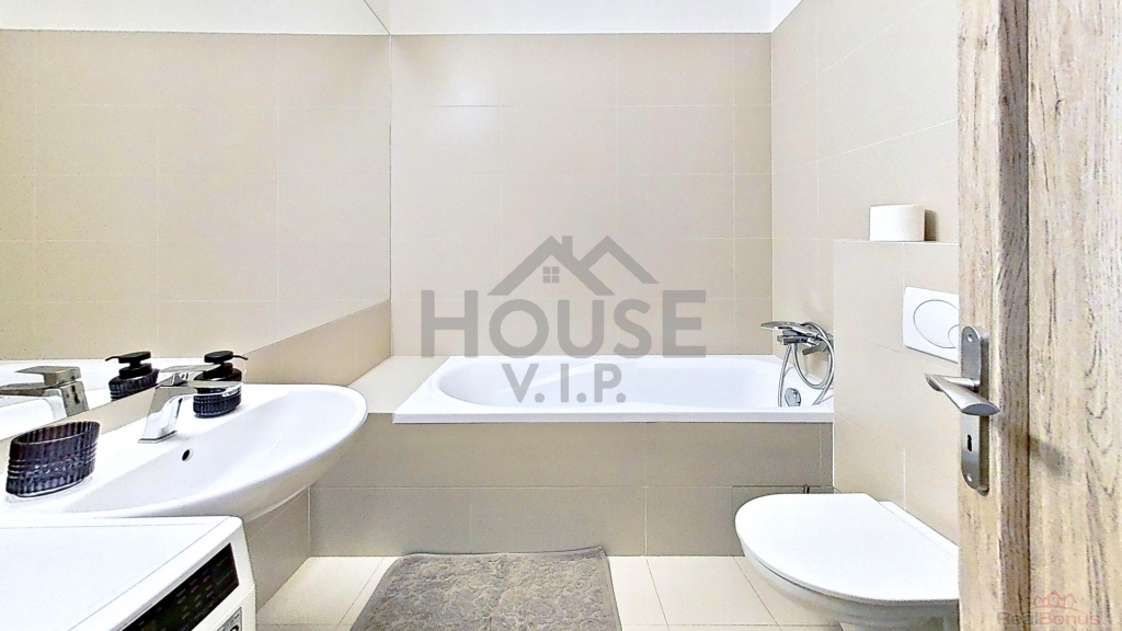 ložnice s vestavěnými skříněmi, koupelna s vanou, WC a pračkou.