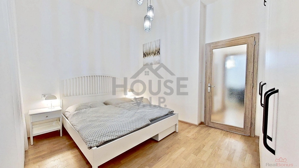 Součástí bytu jsou dřevěné podlahy, vysoké stropy a výhodou je také pouze 2 byty na patře.
