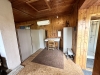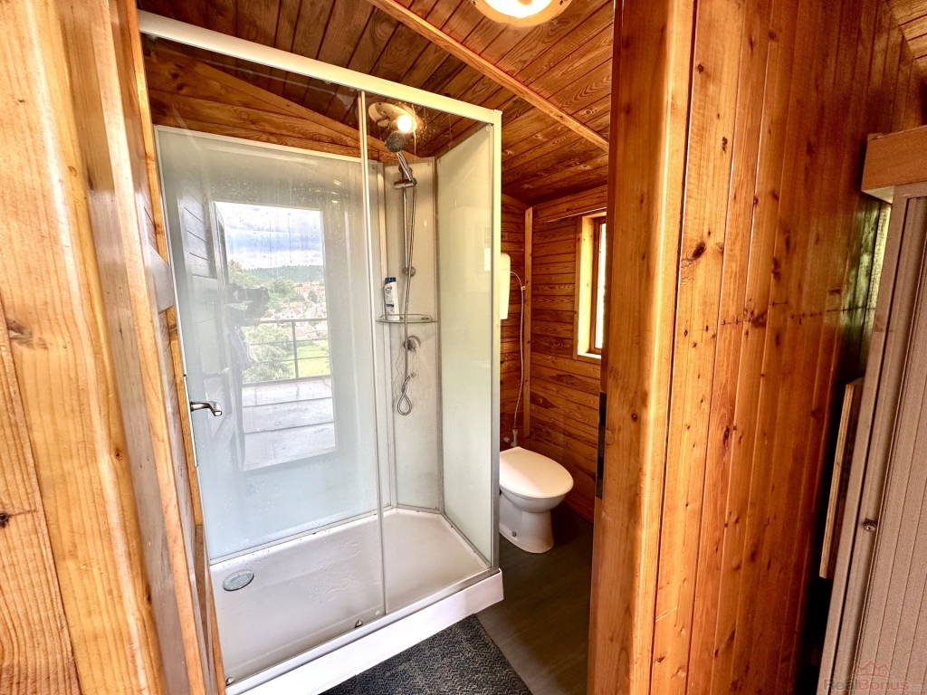 Udržovaná dřevěná chata je patrová, postavena na kamenné podezdívce na svažitém pozemku. V obytné části je velký pokoj s terasou a krásným výhledem do okolí (situováno na východ), koupelna se sprchovým koutem a WC. Dřevěná okna s jednoduchým sklem. K vytápění v chladnějším počasí jsou používána litinová kamna, jinak je možné využít tepelné čerpadlo-vzduch/vzduch i jako klimatizace. Do přízemí je samostatný venkovní vstup, nebo vnitřním dřevěným spojovacím schodišťovým žebříkem z hlavní místnosti. V přízemí je umístěná kuchyň a technická místnost s bojlerem na ohřev vody, přípojka na pračku. Rozvod vody je v plastu. Objekt má evidenční číslo a je napojen na elektřinu 230 i 380V, pitná voda je dovedena čerpadlem z vrtané studny, odpad sveden do jímky.