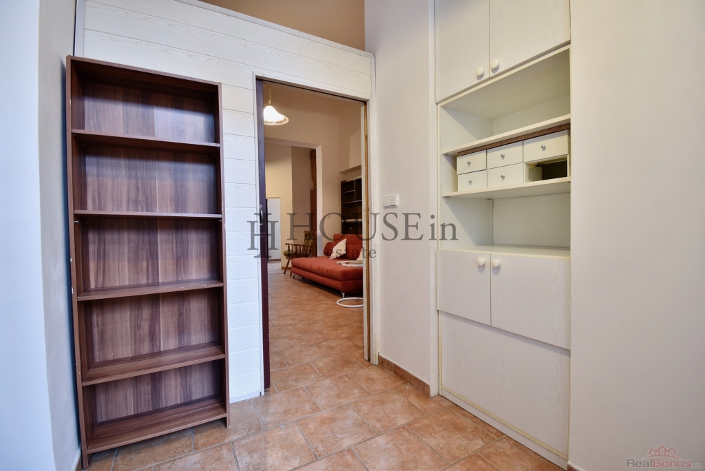 Byt má praktickou dispozici: předsíň se skříní, hlavní obytný prostor s kuchyňskou linkou, samostatnou ložnici a koupelnu se sprchovým koutem. Vstup do bytu je přímo z ulice. Byt se pronajímá částečně zařízený ? k dispozici je kuchyňská linka, lednice s mrazákem, indukční vařič, digestoř, pračka, TV, sedačka, obývací stěna a skříně.