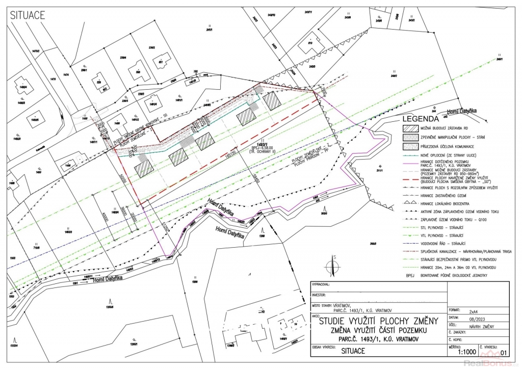 Nabízíme Vám ve výhradním zastoupení majitele k prodeji rovinatý pozemek v obci Vratimov ? Horní Datyně o celkové rozloze 15 602m2.Jedná se o dvě parcely: parcela č.1493/1 o celkové výměře 15.479m2 (trvalý travní porost) a parcela č.1497/2 o celkové výměře 123m2 (zahrada).Pozemek se prodává za cenu 250kč/m2.Inženýrské sítě - voda a elektřina se nacházejí na okraji pozemku. Příjezd k pozemkům je zajištěn z obecní komunikace přes soukromou cestu se zapsáním věcného břemene jízdy a chůze a přes parcelu 1497/2 ve vlastnictví prodávajícího, kterou je možno po domluvě také koupit nebo zapsat podíl na LV. V 08.2023 byla podána žádost na stavebním odboru ve Vratimově na změnu využití částí pozemku parc.č. 1493/1, k.ú. jenž se nachází v nezastavěném území obce ve funkční ploše zemědělské ? Z, Vratimov. Předmětem záměru je návrh změny využití částí pozemku parc.č. 1493/1, k.ú. Vratimov, na zastavitelnou plochu smíšenou obytnou - SO. Předmětem záměru je návrh změny využití částí pozemku parc.č. 1493/1, k.ú. Vratimov, na zastavitelnou plochu pro možnou budoucí zástavbu rodinnými domy. V předmětné ploše může vzniknout 5 stavebních pozemků o ploše cca 950-960m2 pro výstavbu RD. Dopravní obsluhu lokality by zajišťovala nová účelová komunikace ze severozápadní strany pozemku, ze které by byly řešené sjezdy k jednotlivým pozemkům RD. Sjezdy k jednotlivým pozemkům jsou dostačující pro odstavení vozidel před vjezdem na jednotlivé pozemky, ale i pro možnost vyhýbání protijedoucích automobilů. Oplocení jednotlivých pozemků RD by bylo situováno tak, aby byl zajištěn prostor veřejného prostranství 8m. Do prostoru veřejného prostranství by byly umístění stavby technické a dopravní infrastruktury tj. účelová komunikace, prodloužený vodovodní řád, splašková kanalizace a podzemní vedení el. Energie NN. Pozemek je na velmi pěkném místě s dobrou dostupností do okolních měst jak autem, tak MHD. Pro bližší informace nám volejte nebo nás můžete osobně navštívit v Hlučíně na Mírovém náměstí 5/5, Hlučín. Všechny inzerované fotografie nemovitosti naleznete na naších webových stránkách.