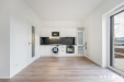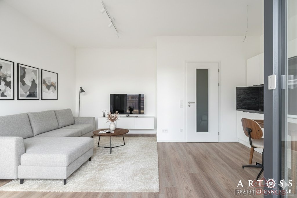 Světlý obytný prostor s velkým francouzským oknem s elektrickými žaluziemi, díky kterému je byt krásně prosvětlený.