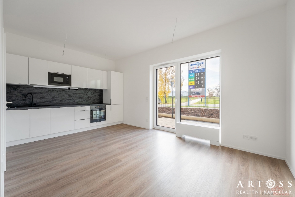 Pronájem novostavby 1+kk 30,5m2 se zahrádkou 28m2 a parkovacím stáním 12m2 ? Rezidence Pohořelice, ul. U kasáren.