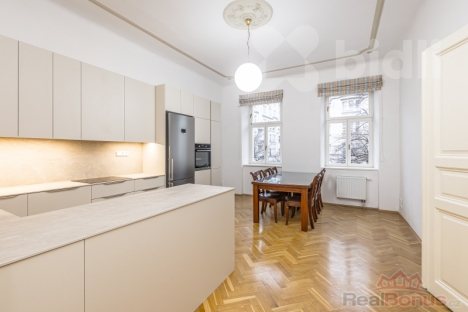 Byt je zrekonstruován a nachází se v prvním patře a je vybaven novou luxusní kuchyňskou linkou a novými spotřebiči - trouba, varná deska, myčka, lednice s mrazákem, má čtyři neprůchozí pokoje a zahrnuje dvě koupelny a dvě toalety.