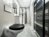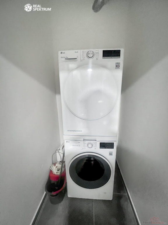barový stůl, police a praktické spací patro šetřící prostor. Dále se zde nachází pračka a sušička, sprchový kout, vlastní elektrický kotel a bezpečnostní vstupní dveře.