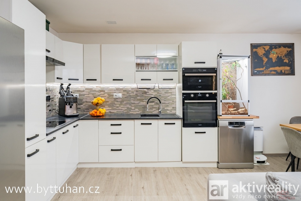 Byt nabízí praktickou dispozici s centrální chodbou, prostorný obývací pokoj propojený s kuchyňským koutem vybaveným vestavěnými spotřebiči, ložnici a dětský pokoj. V obývacím pokoji je klimatizace sloužící k chlazení i vytápění.