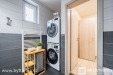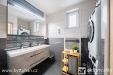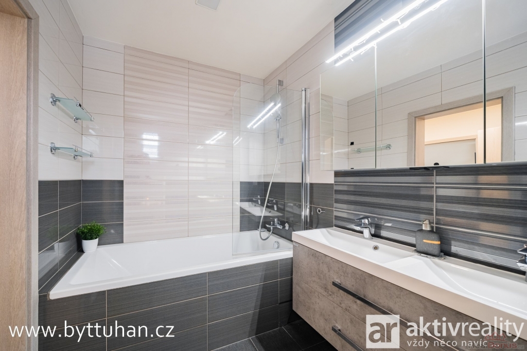 Koupelna disponuje vanou se sprchovou zástěnou, dvěma umyvadly a místem pro pračku i sušičku.