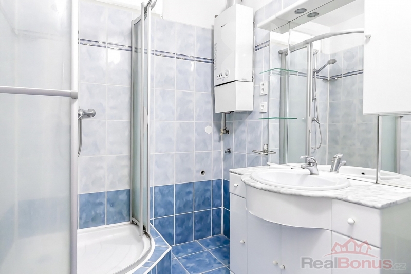 Koupelna je zděná, se sprchovým koutem, je zde umístěn plynový kotel pro ohřev vody.