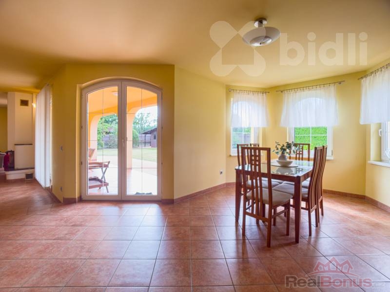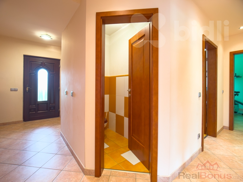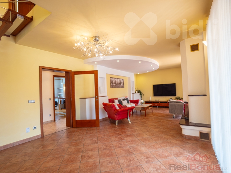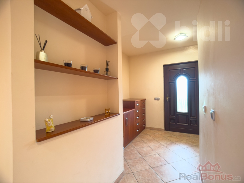 Komfort bydlení ještě zvyšuje podlahové vytápění v celém domě, centrální vysavač a studna. Na dům navazuje prostorná garáž, kryté parkovací stání a na zahradě kromě bazénu potěší i zahradní domek.
