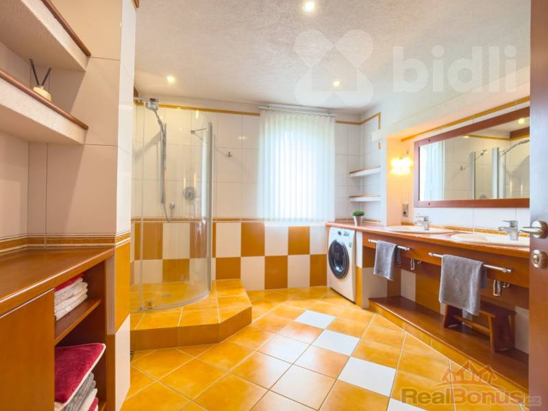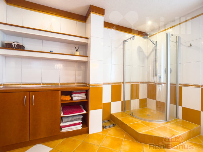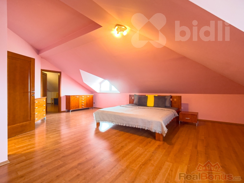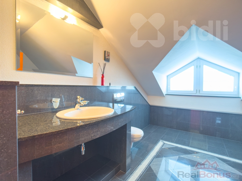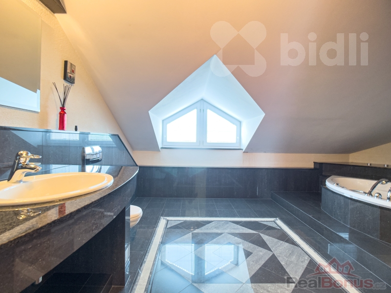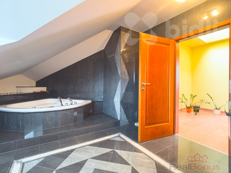 V patře se nachází další ložnice, dva samostatné pokoje, šatna a stylová koupelna s rohovou vanou, která nabízí opravdový relax po dlouhém dni.