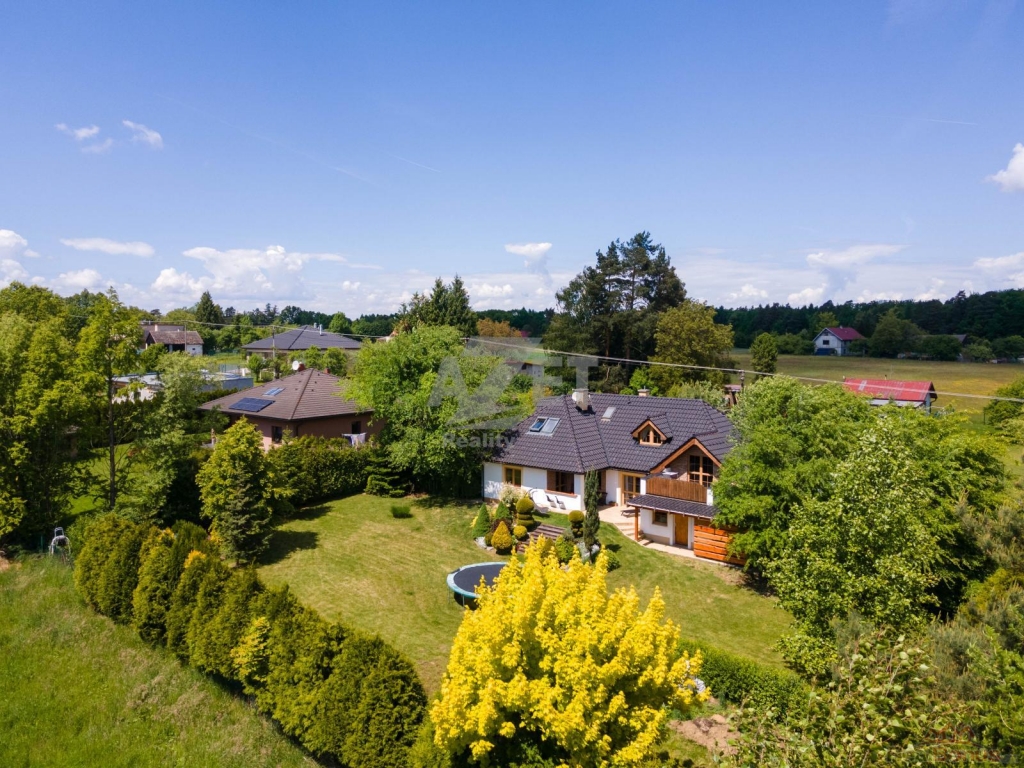 Dvoupodlažní, nepodsklepený a velmi dobře izolovaný dům o dispozici 7+kk nabízí velkorysou podlahovou plochu 246 m a je umístěn na pozemku o výměře 1 794 m. Zastavěná plocha činí 270 m2. Dům se nachází ve slepé ulici, obklopený ze tří stran lesy, což zajišťuje výjimečný klid a soukromí.