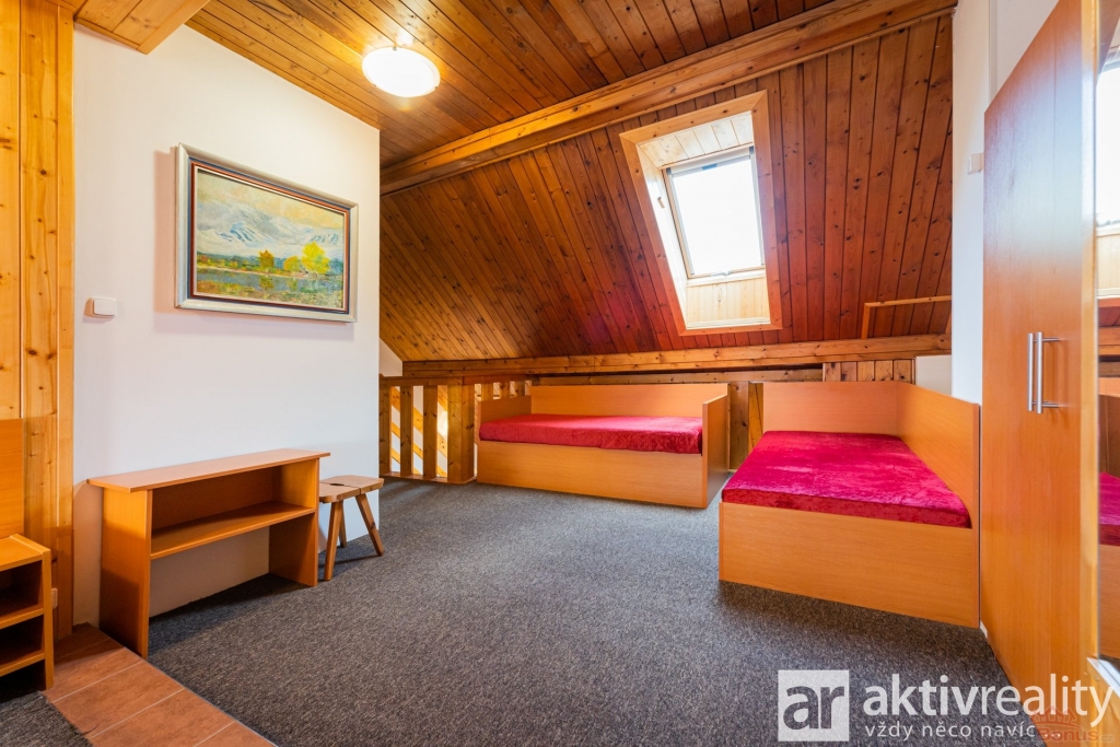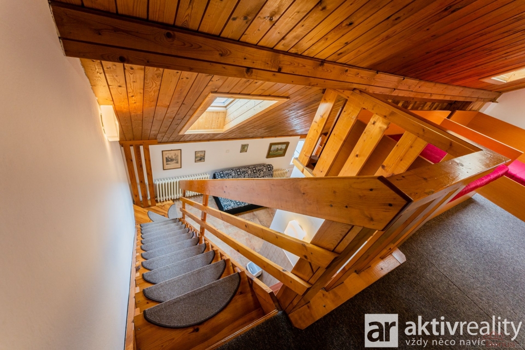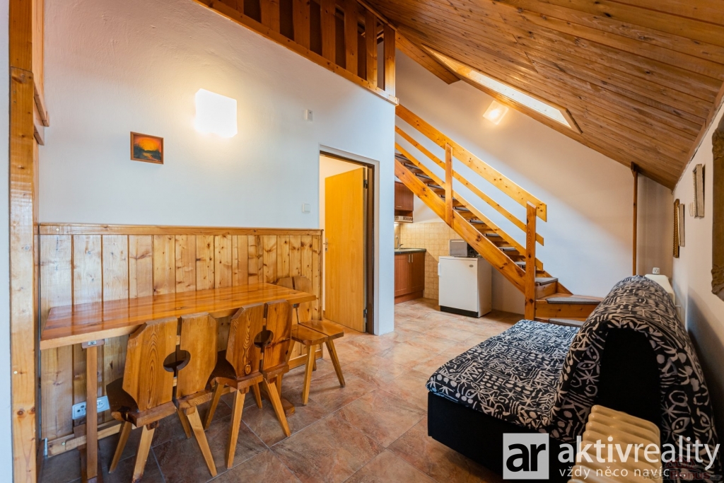 V podkroví se nachází prostorná obytná místnost s možností oddělení klidové části na spaní, koupelna se sprchovým koutem a WC. Díky mezonetovému řešení působí byt vzdušně a nabízí dostatek soukromí.