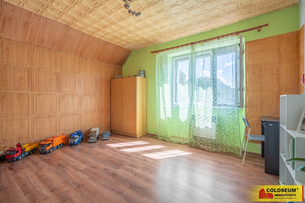 V přízemí domu se nachází kuchyně, obývací pokoj, ložnice, koupelna, toaleta, komora, předsíň a zádveří. V horním patře je k dispozici další pokoj a půdní prostor.