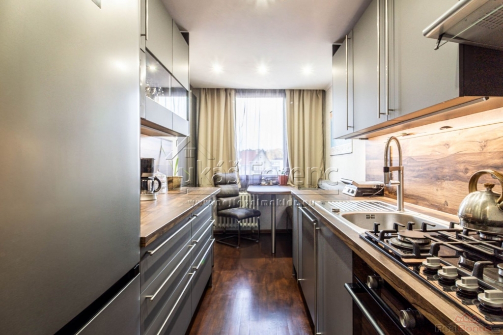 Byt zaujme praktickou dispozicí i vysokým standardem vybavení. Je připojený k zabezpečovacímu systému Jablotron, přístup do bytu vede přes uzamykatelnou chodbu oddělenou od výtahů a schodiště. Kuchyňská linka na míru v hodnotě 260 000 Kč byla instalována před 2 měsíci a je vybavena vestavnými spotřebiči (myčka, plynový sporák, elektrická trouba, digestoř, lednice s mrazákem). V bytě jsou snížené stropy s bodovými světly, v ložnici i pokoji v horním patře lesklé stropní panely. V předsíni i pokojích jsou prostorné vestavěné skříně a další úložný prostor nad schodištěm.