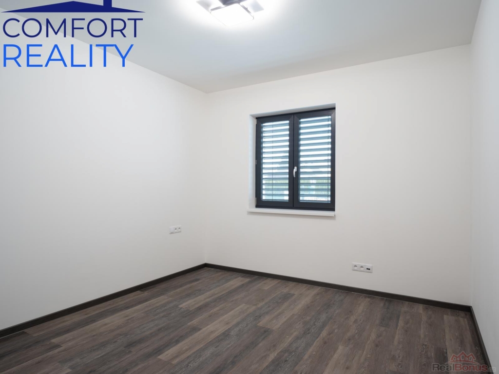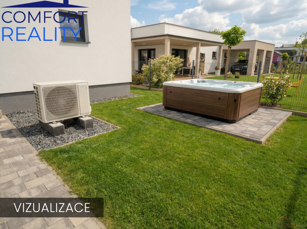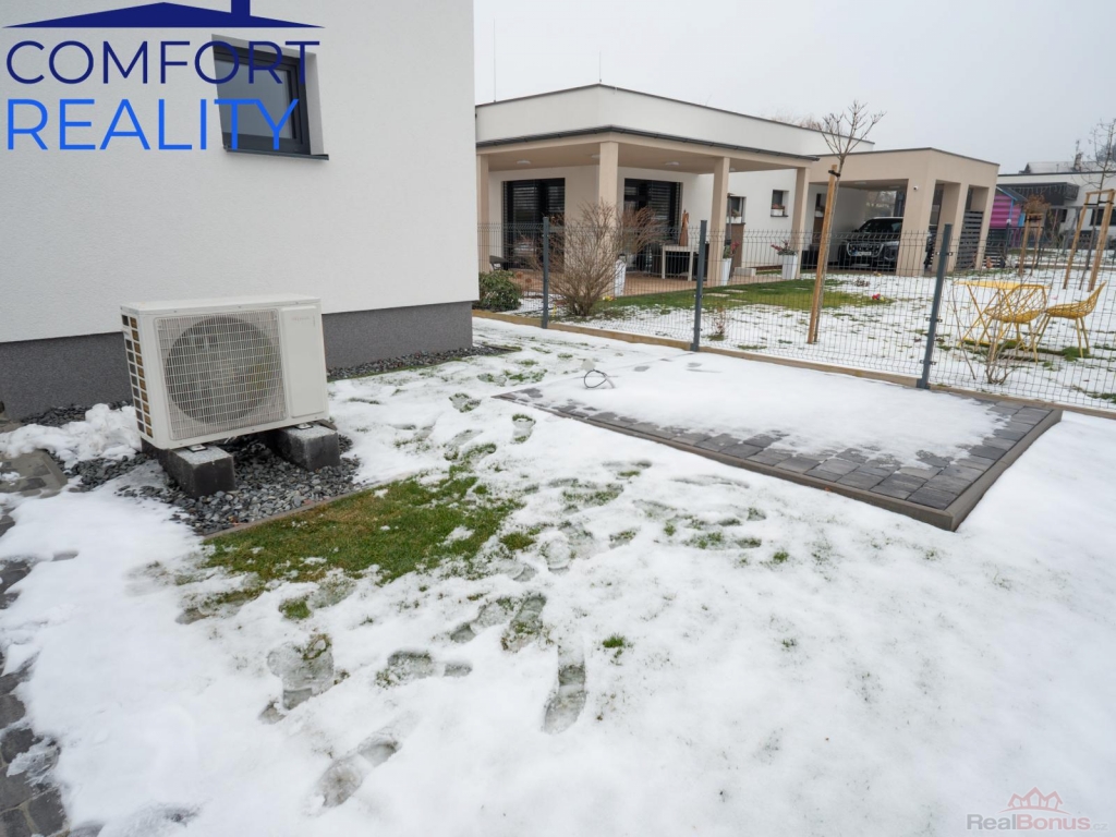Interiér působí čistě a nadčasově: vinylové podlahy, moderní osvětlení, velké prosklení s venkovními elektrickými žaluziemi a důraz na funkční detaily. Srdcem domu je obývací prostor s kuchyní luxusní kuchyňská linka a navazující jídelní část. Komfort zajišťuje podlahové vytápění napojené na kvalitní tepelné čerpadlo Viessmann, dále samostatná klimatizace.