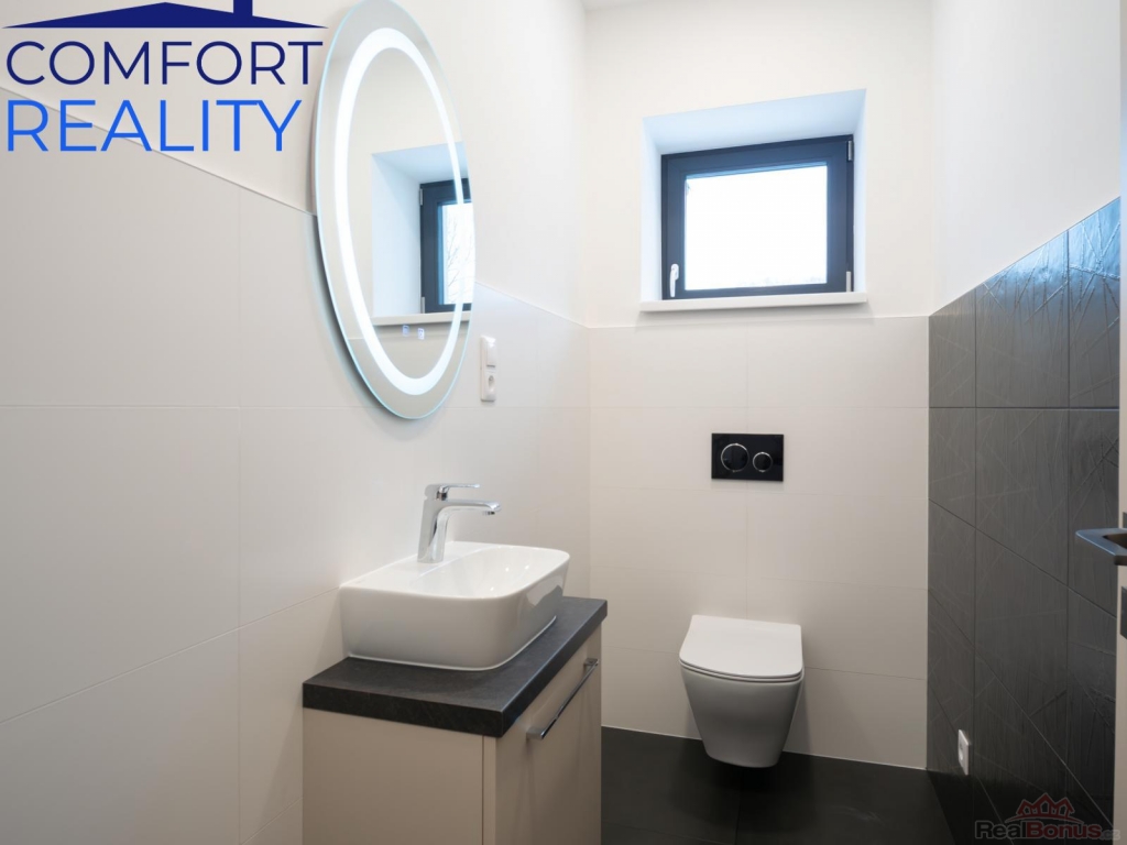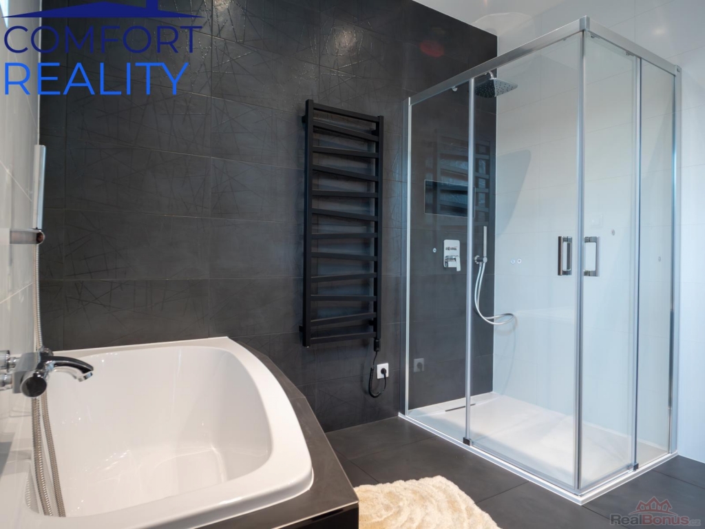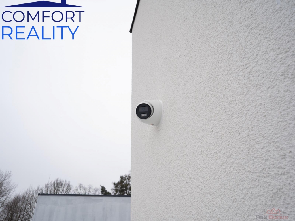 Dispozice je řešena velmi prakticky: 2× WC (jedno samostatné, druhé v koupelně), koupelna s vanou i sprchovým koutem, a k tomu technická místnost. Bezpečnost podporuje kamerový systém.