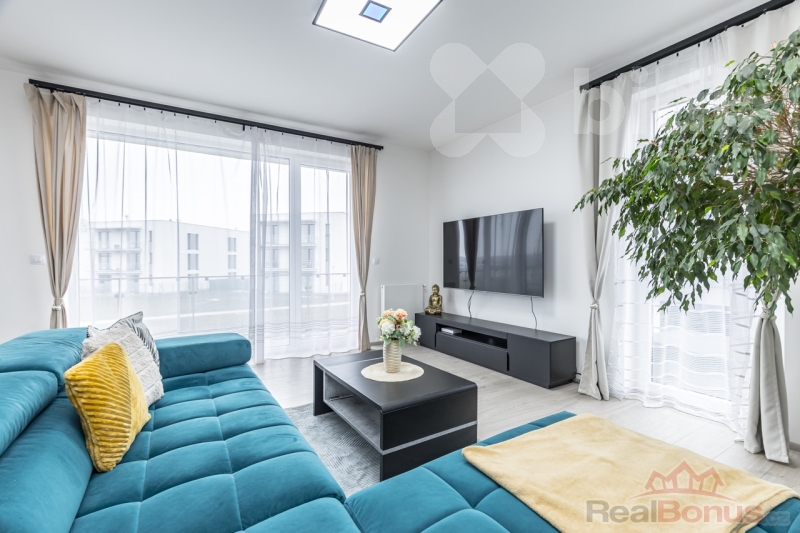 Dispozice bytu je velmi praktická a nabízí vysoký komfort pro každodenní život. Dominantou bytu je prostorný obývací pokoj s kuchyňským koutem, který je vybaven moderní kuchyňskou linkou včetně vestavěných spotřebičů. Celý prostor je vzdušný a díky velkoformátovým oknům a jihozápadní orientaci velmi světlý po celý den. Předokenní žaluzie pak zajistí dostatečnou ochranu před horkým letním sluncem a dodají i maximální míru soukromí.