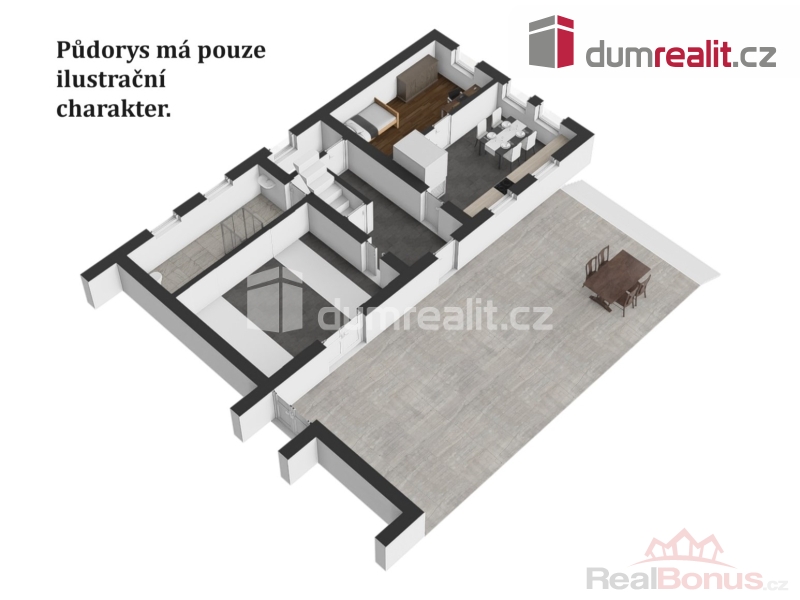 Doménou je pak prosluněná terasa o cca 65 m, pod kterou je níže zapuštěn bazén.