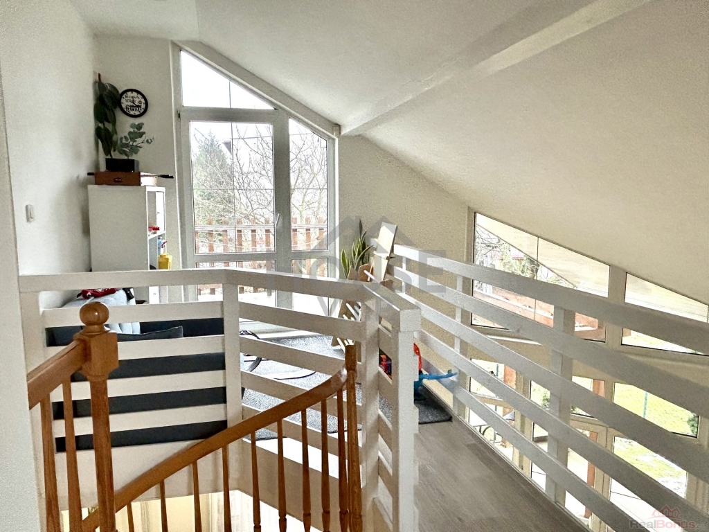 V patře je galerie s relaxační zónou, pracovna, dětský pokoj, ložnice, šatna, prostorná koupelna s vanou a vstup na balkon o ploše 6,67 m2 orientovaný na jih.