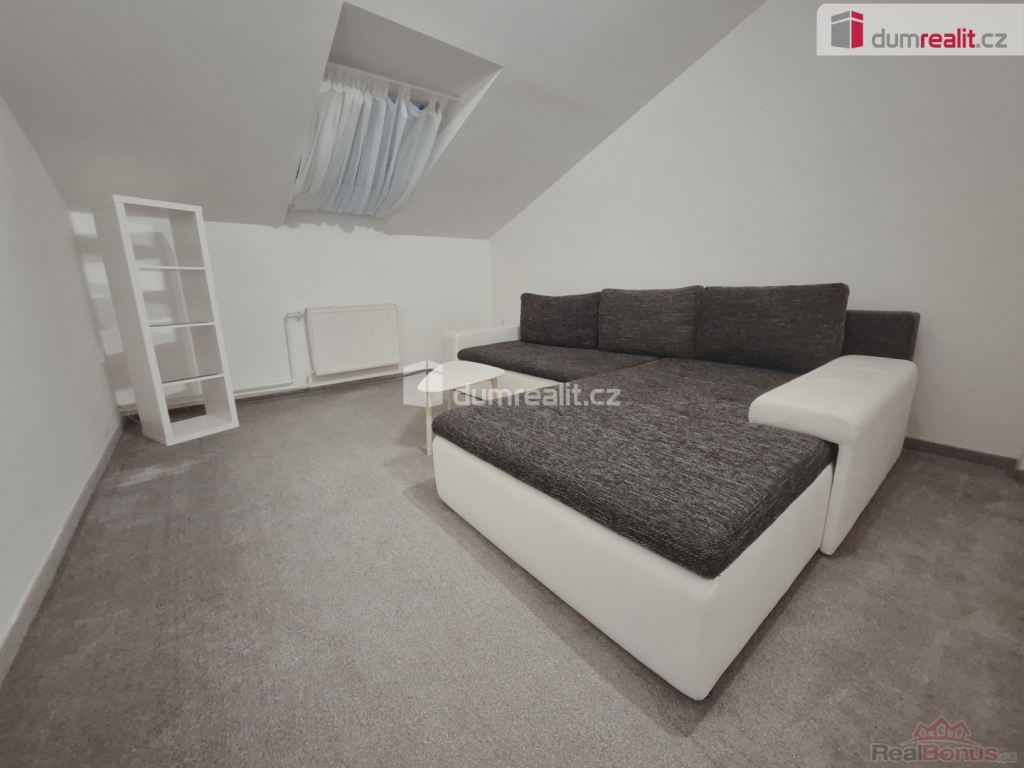 Ze vstupní haly se dostaneme do samostatné koupelny, odděleného WC, ložnice a kuchyně a z ní pak do obývacího pokoje. Tři místnosti mají střešní okna, ložnice pak okno klasické dvoukřídlé. Podlahová krytina je nakombinovaná, je zde koberec i lino.