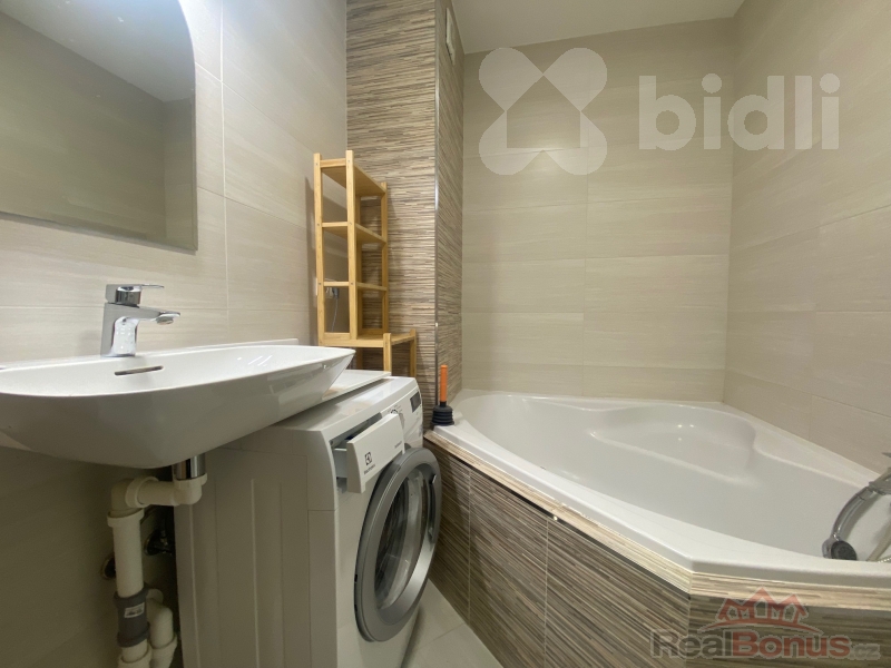 Součástí koupelny je vana i sprchový kout, kuchyně je vybavena indukční varnou deskou, troubou a myčkou.
