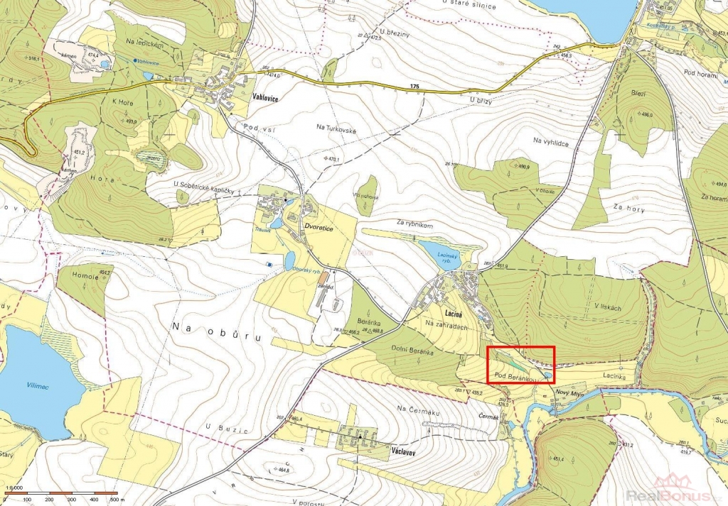 Pozemek stojí v okrajové samostatné lokalitě mezi vesnicí Vahlovice a okolní zemědělskou krajinou.