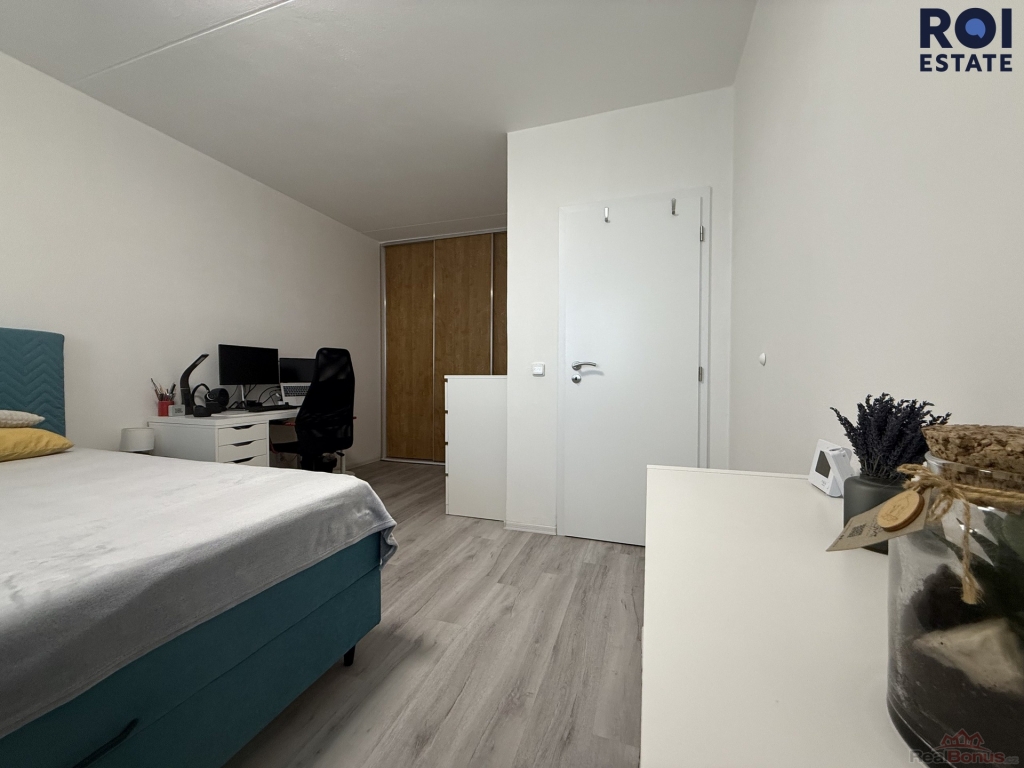 Dále následuje samostatné vstupy do místnosti s kuchyňským koutem a ložnicí, nutno podotknout, že podlaha, která se zde nachází má vysokou odolnost kvality. Celý byt čeká na dovybavení podle Vašich představ a fantazií. K tomu navíc ložnice poskytuje úložný prostor v podobě vestavěné skříně, kam si můžete uložit své oblečení. Mezi největší výhody tohoto bytu je velmi prostorný balkon, který Vám poskytne jak soukromí, tak i nádherný výhled na celé Brno.