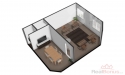 Dispozice prostoru tvoří jedna větší místnost, jedna menší a vlastní sociální zázemí. Jednotka je situována ve 2. nadzemním podlaží budovy určené ke komerčním účelům.