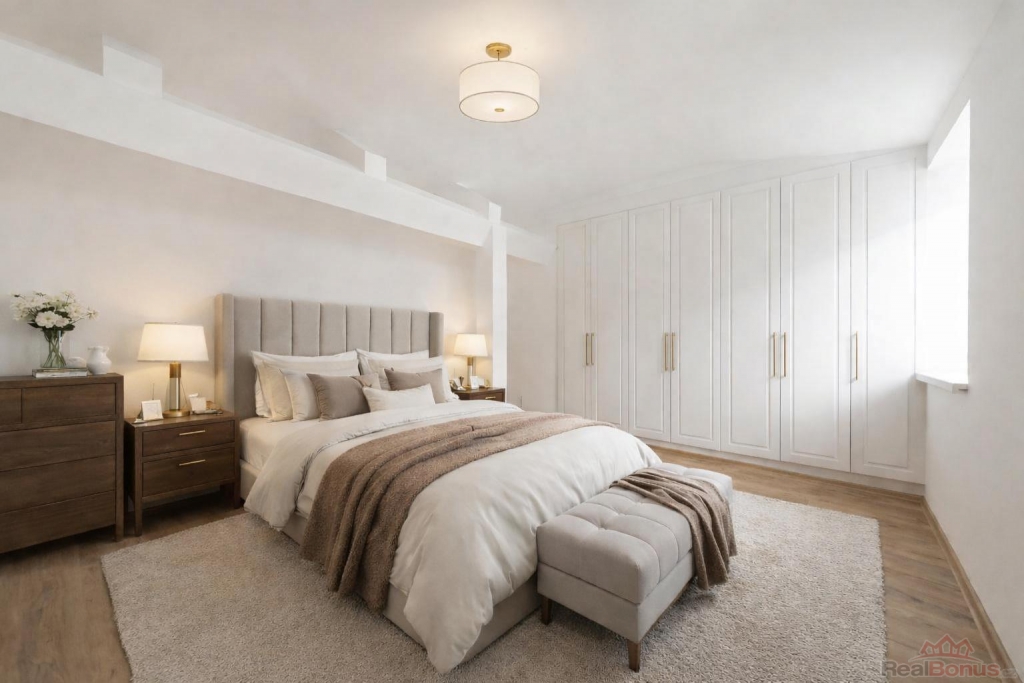 Byt zaujme promyšlenou dispozicí: tři komfortní ložnice doplňuje prostorný obývací pokoj plynule propojený s moderní kuchyní. Elegantní koupelna a samostatné WC zajišťují maximální komfort každodenního života.