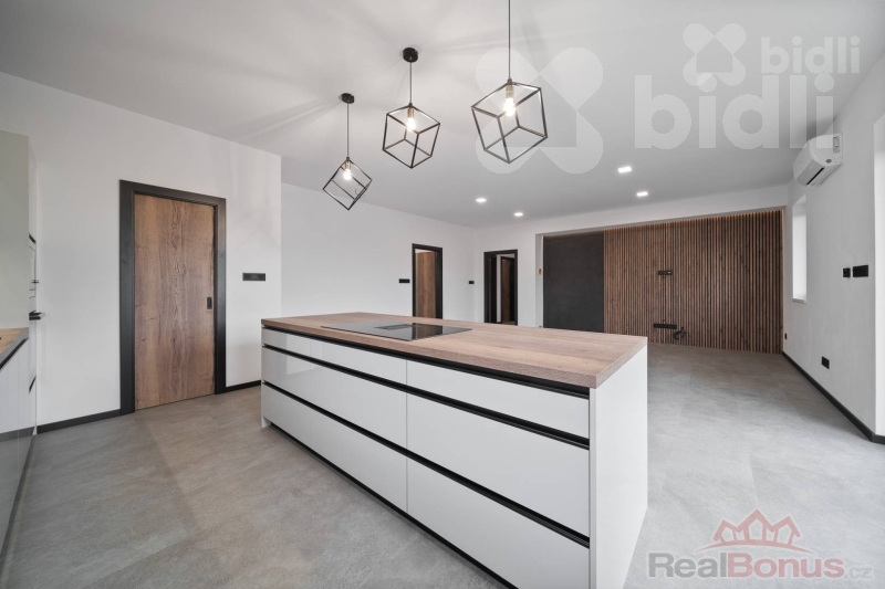 Kuchyňská linka je vyrobena na míru a osazena kvalitními spotřebiči (např. Franke - varná deska s integrovaným odsáváním). Velkou výhodou je samostatná spíž přístupná přímo z kuchyně.