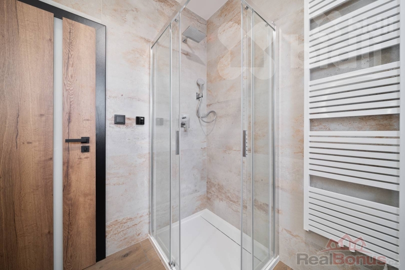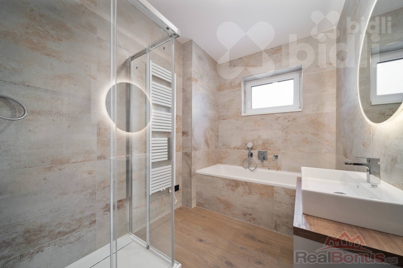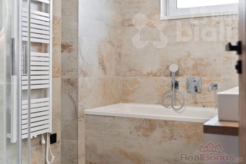 Koupelny jsou provedené ve vysokém standardu: velkoformátové obklady, podomítkové baterie Hansgrohe, keramika Ideal Standard / Vitra, skříňky na míru, zrcadla a elektrická otopná tělesa. Jedna koupelna nabízí sprchu i vanu, druhá nadstandardně velkou vanu + WC.