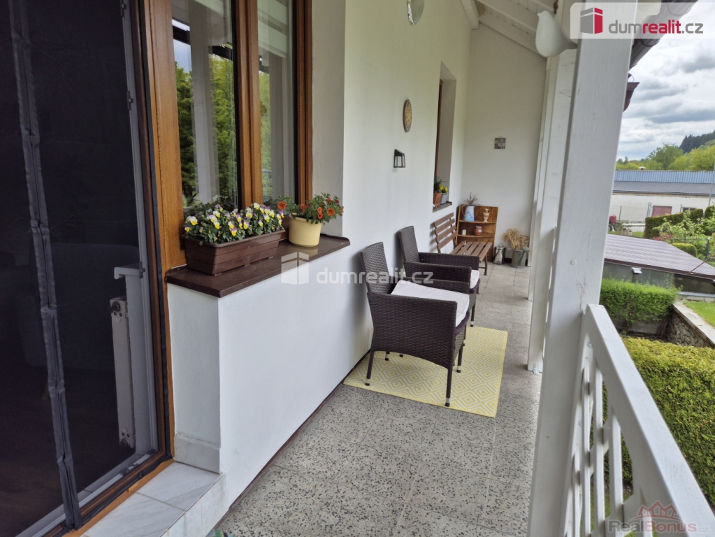 V prvním obytném patře nalézáme kuchyň s moderní kuchyňskou linkou, jídelnu, obývák o 22,4 m s přístupem na zastřešenou terasu přes celou šířku domu, s krásným výhledem na udržovanou svažitou zahradu, dále komoru a koupelnu se sprchovým koutem, umyvadlem a WC.