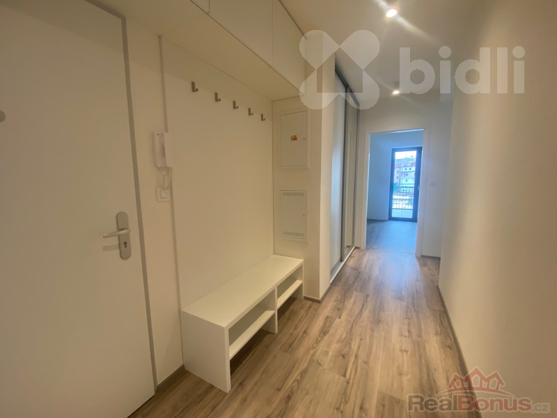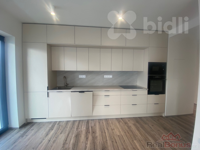 Součástí kuchyňské linky jsou vestavěné spotřebiče( lednice, myčka, indukční varná deska, trouba, MWT), v ložnici se nachází velká šatní skříň.