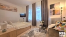 - Obývací pokoj / Ložnice: Prostorný pokoj vybavený manželskou postelí, pohovkou, TV stěnou a úložnými prostory.