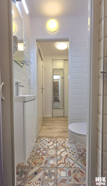 - Koupelna a WC: Koupelna se sprchovým koutem a toaletou, designové obklady.