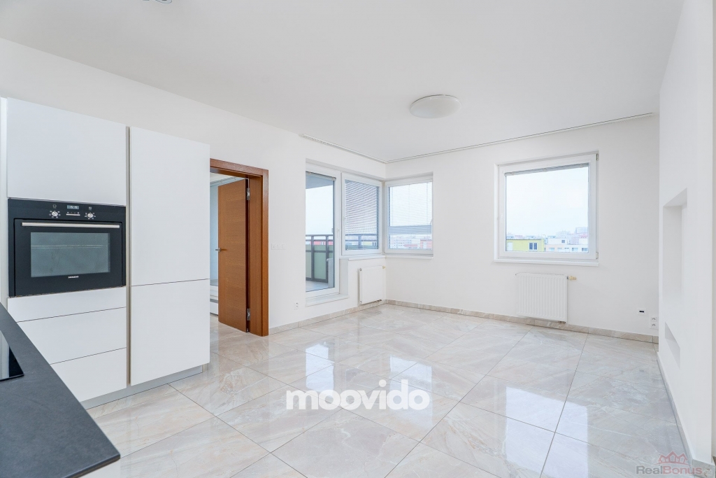 Nabízíme k prodeji moderní byt 3+kk s velkou zastřešenou lodžií v 9. patře novostavby z r. 2014. Jedná se o bytovou jednotku, která se skládá celkem z 3 pokojů, z nichž nejmenší je umístěn za ložnicí a může sloužit buď jako prostorná šatna nebo jako pracovna, příp. menší dětský pokoj (má vlastní velké okno). Z obou větších pokojů je přístup na prostornou lodžii, která může v letních měsících sloužit jako další obytný prostor. Byt je vybaven kuchyňskou linkou Hanák (spotřebiče Siemens a Franke), koupelna i ostatní interiérové prvky bytu jsou v nadstandardním provedení. V celém bytě je na podlaze velkoformátová dlažba. Samozřejmostí jsou bezpečnostní vstupní dveře. Možno dokoupit garážové stání.