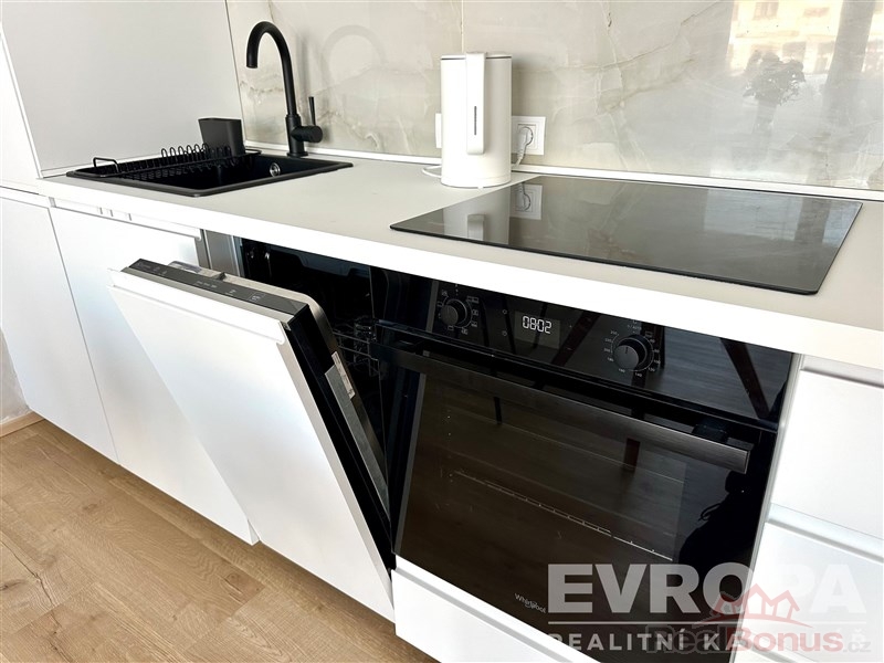 Kuchyňská linka je vybavená spotřebiči (lednice, myčka, trouba a varná deska, mikrovlnka).