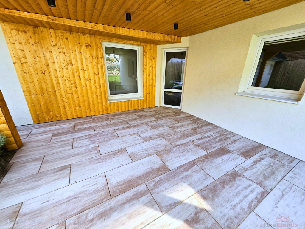 Dům zahrnuje: vstupní halu, tři ložnice, prostorný obývací pokoj s kuchyňským koutem a přímým vstupem na zastřešenou terasu, koupelnu s WC,
