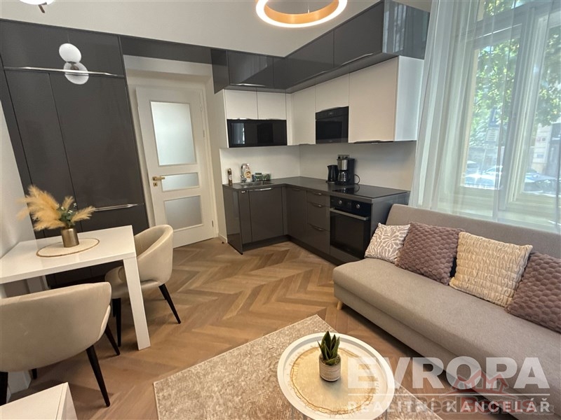 Cozy fully equipped apartment with a terrace at prestigious address in the center of Prague with dispositions 2+kk and size 39 m2. Living room with kitchenette, set of dishes, kettle and coffee maker. In the living area there is a sofa bed for third guest, big TV and WiFi. In the bedroom there is a queen size bed including bed linen. In the bathroom there is a walkin shower. Perfect civic amenities, cafes, shops, metro, tram nearby. Quiet location only a few minutes from center. Monthly rent is 29.000 CZK + utilities, deposit in amount of one month rent, commission in amount of one month rent + VAT. Call broker for more information. Available from 4.7.2026