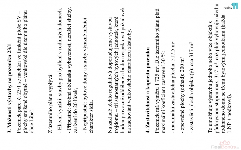Již máme vypracovanou studii pro výstavbu rodinného domu o třech bytových jednotkách, ale je dle územního plánu možnost stavby pro bydlení v rodinných domech, možná drobná občanská vybavenost, nerušící služby, zařízení do 20-ti lůžek, nepřípustné jsou bytové domy.