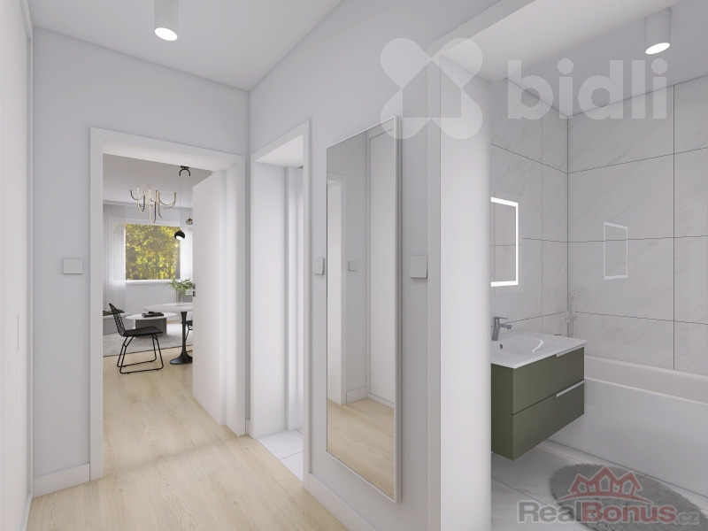 V inzerci jsou kromě reálných fotografií použité i vizualizace bytu po případné rekonstrukci.