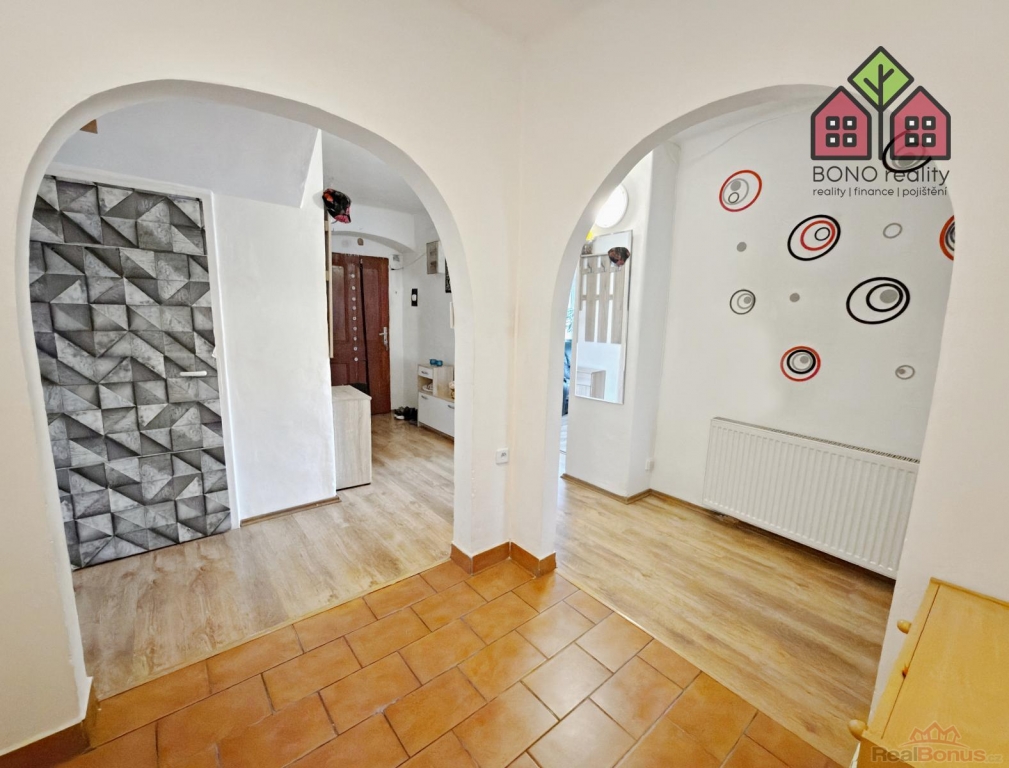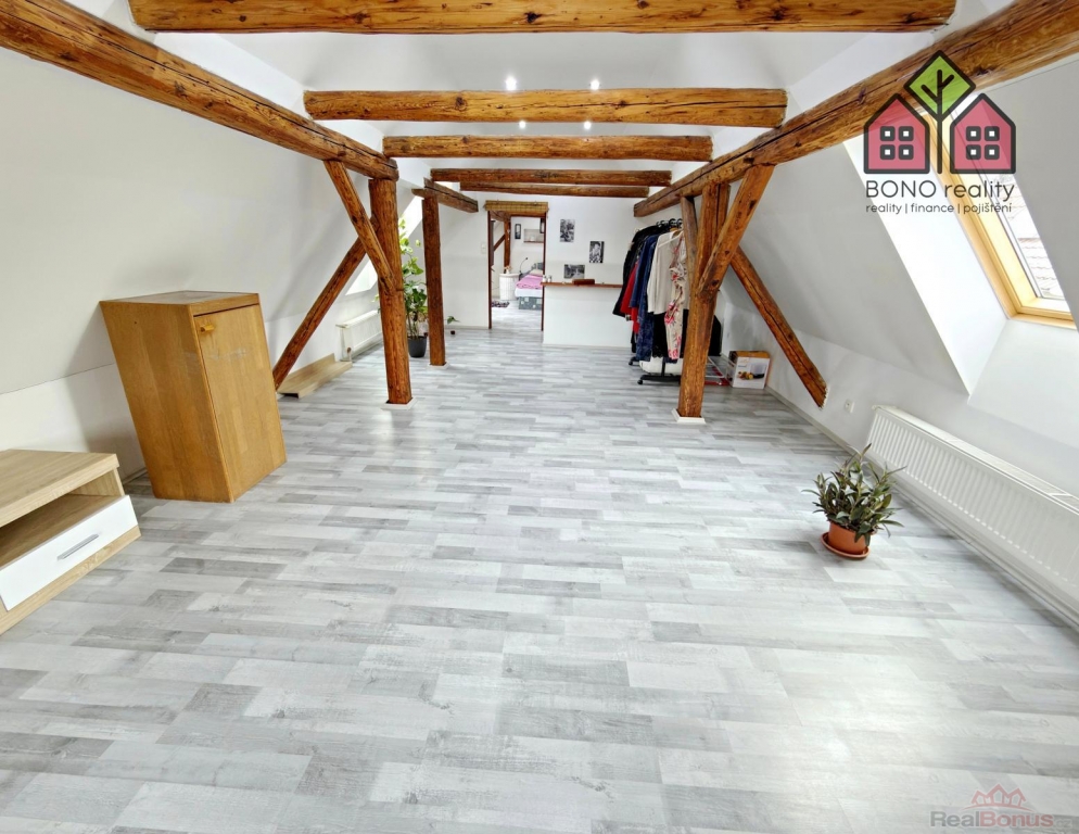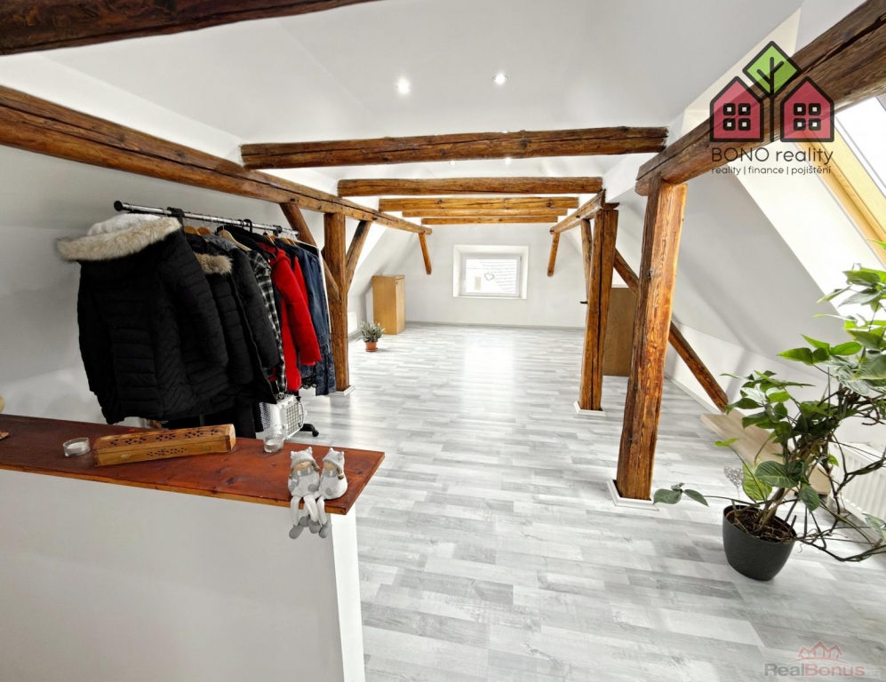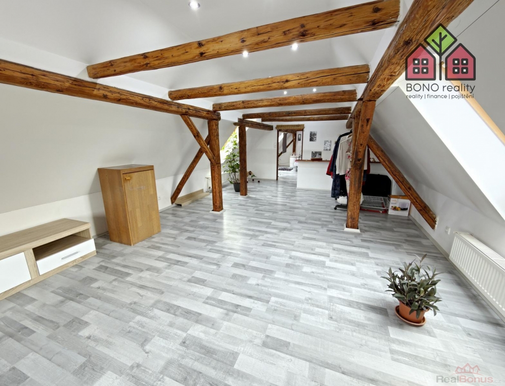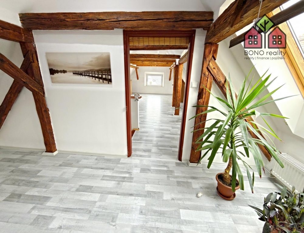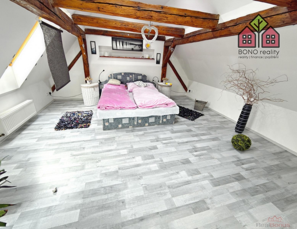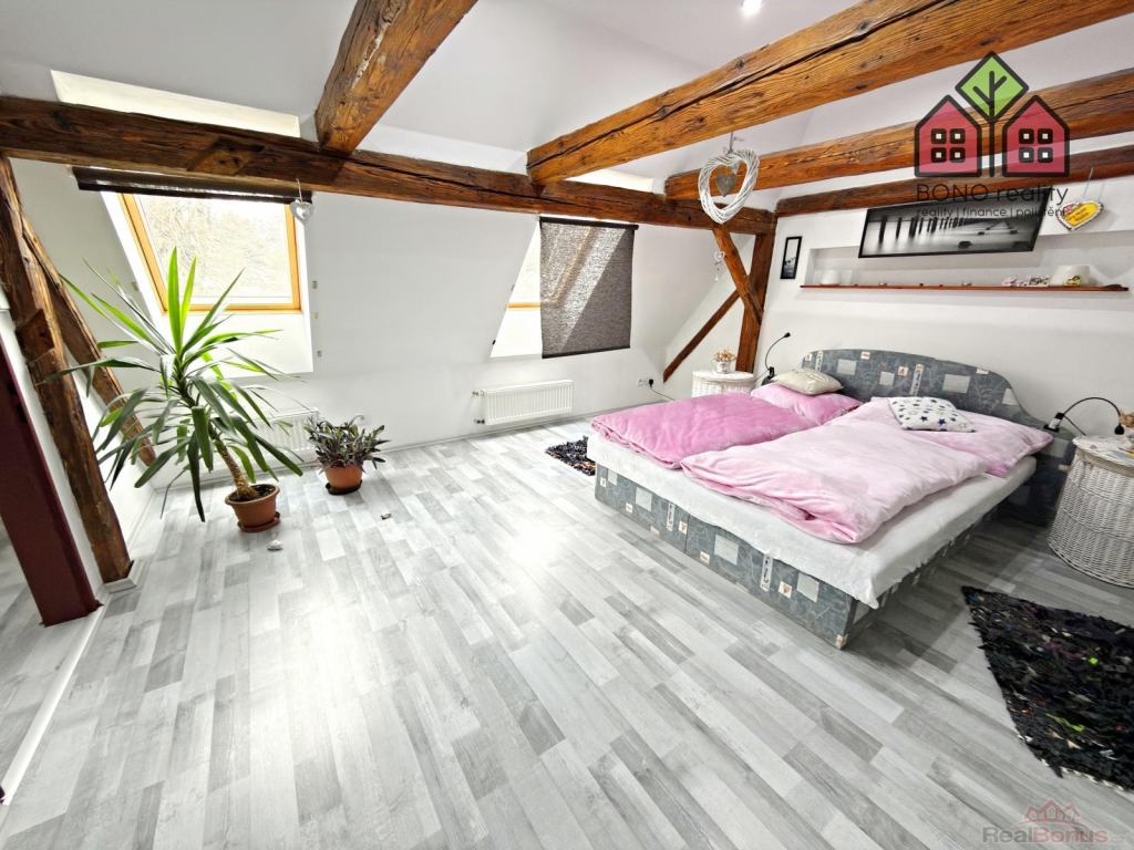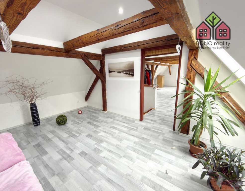 Nenápadný vstup z hlavní chodby domu Vás pak přivede dřevěným schodiště do obytného podkroví, které Vám zaručí naprosté soukromí. V pravé části podkroví je umístěna ložnice a v levé části je pak dosud nevyužitý velký prostor. Oba prostory mají přiznané trámoví a mohou opravdu splnit veškerá Vaše očekávání a přání. V podkroví jsou tedy nyní dva pokoje s připravenými rozvody elektřiny, vody a kanalizace. Prostor je však velmi variabilní, lze zde vybudovat další byt o dispozici například 2+kk, nebo až tři pokoje. Celý prostor je pak osvětlen dřevěnými střešními okny a na podlaze je položena plovoucí podlaha.